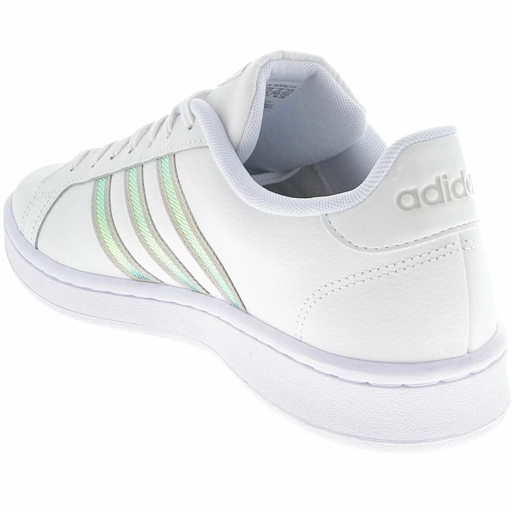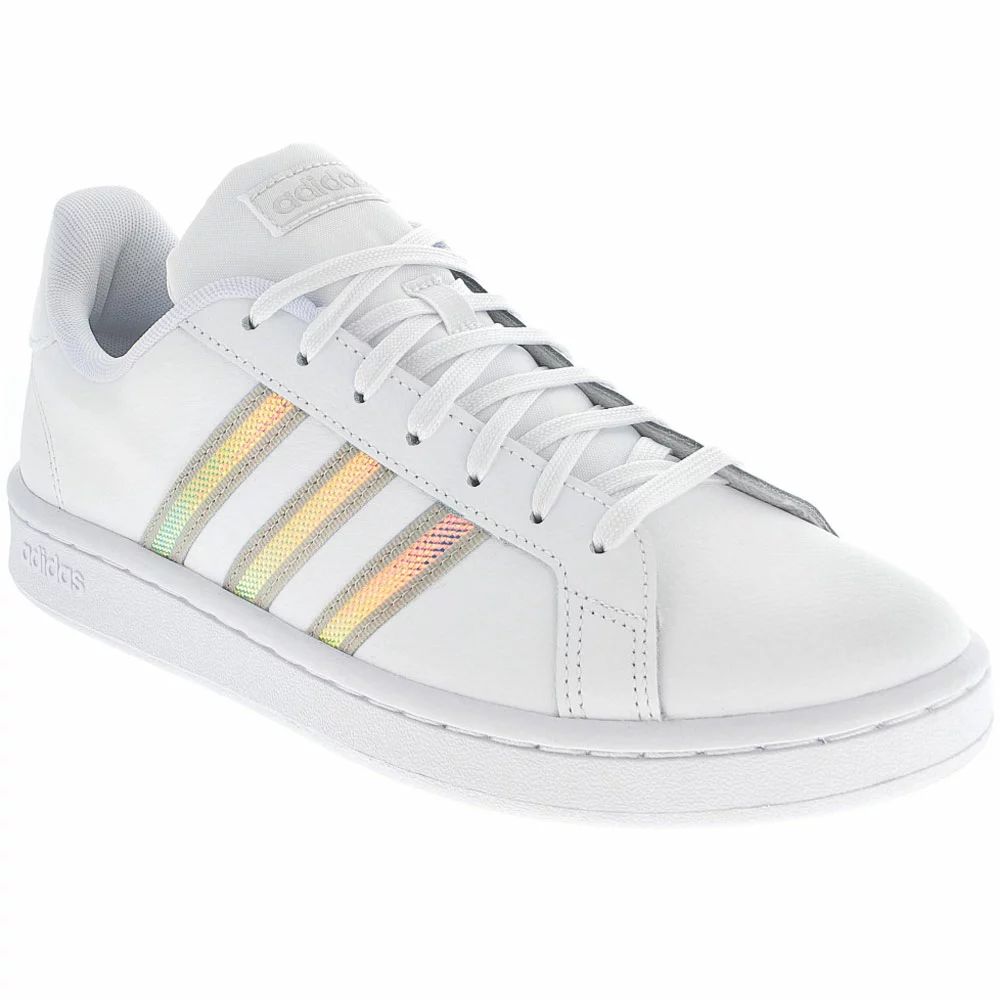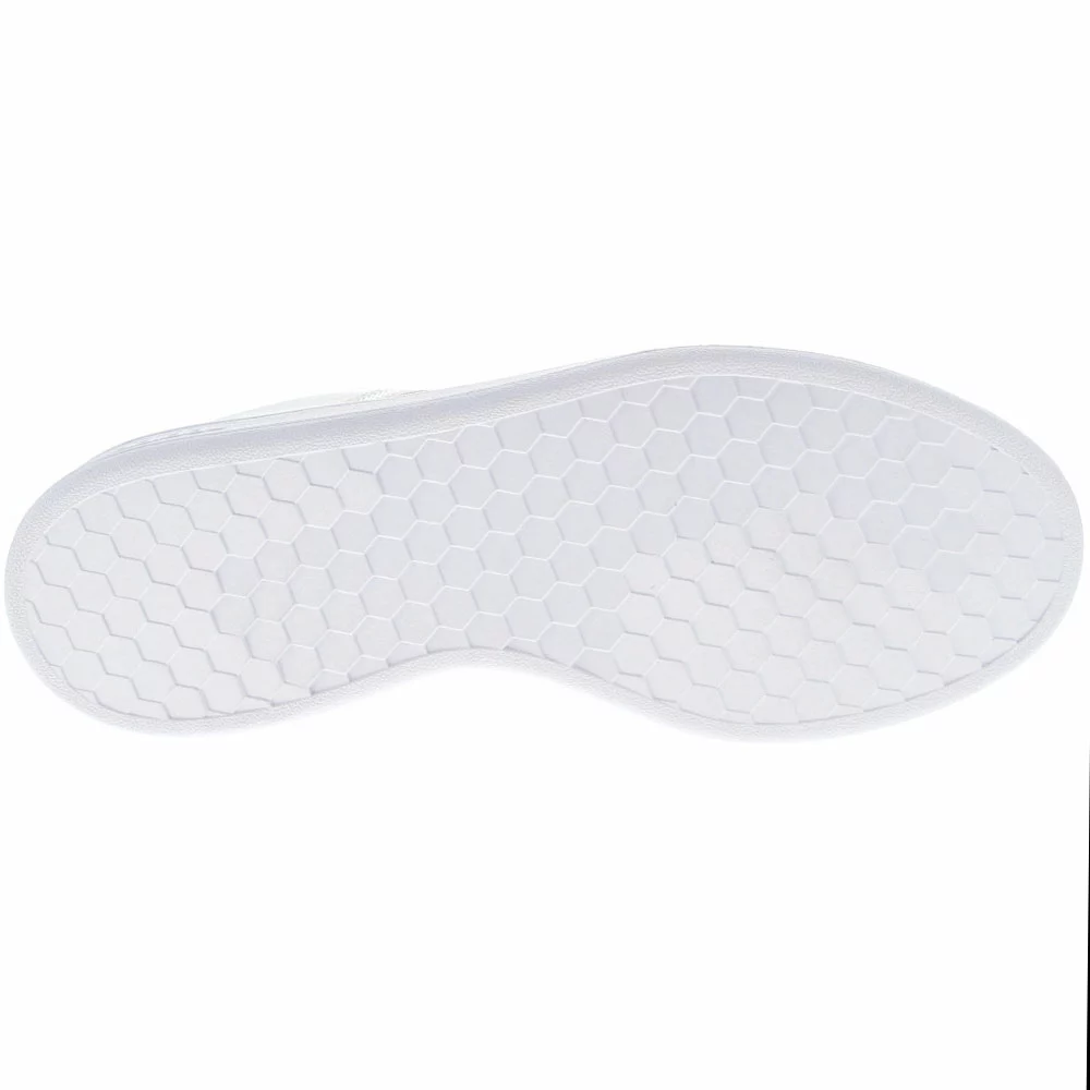 Adidas Grand Court Women’s Life Style Shoes. You will love having all of the benefits of the classic Adidas women’s lifestyle athletic shoes without all the bulk in this updated version. Clean lines and sleek styling are accented by the classic Adidas 3-Stripes in black against a crisp white synthetic leather upper. A stitched-on rubber outsole provides grip on most surfaces. The Cloudfoam Comfort sockliner and padded collar offer comfortable wear all day and the adjustable lace closure gives a custom fit every time.