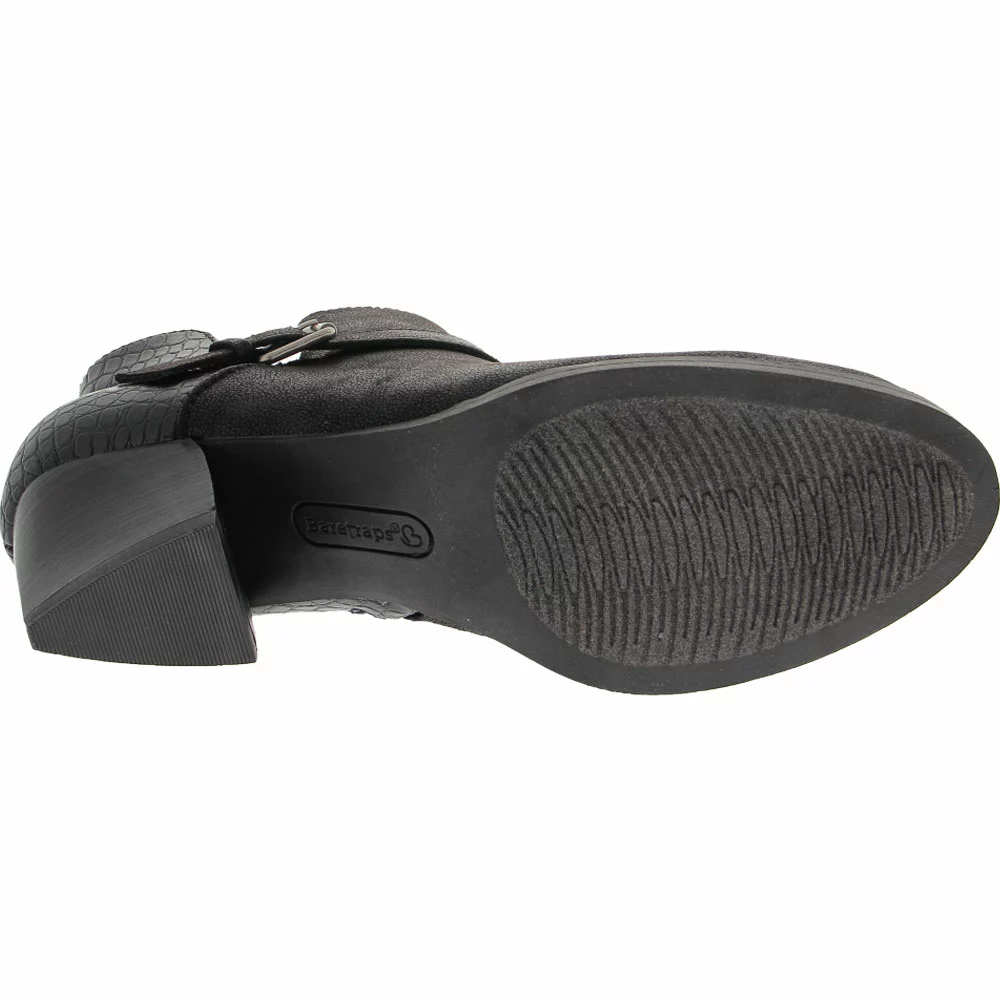 BareTraps Lexis Womens Ankle Boots. High end style with everyday comfort, the Lexis block heel bootie is a great compliment to causal and business outfits. Strap and buckle design with a unique back detail and real leather stacked heel make this boot an everyday choice..