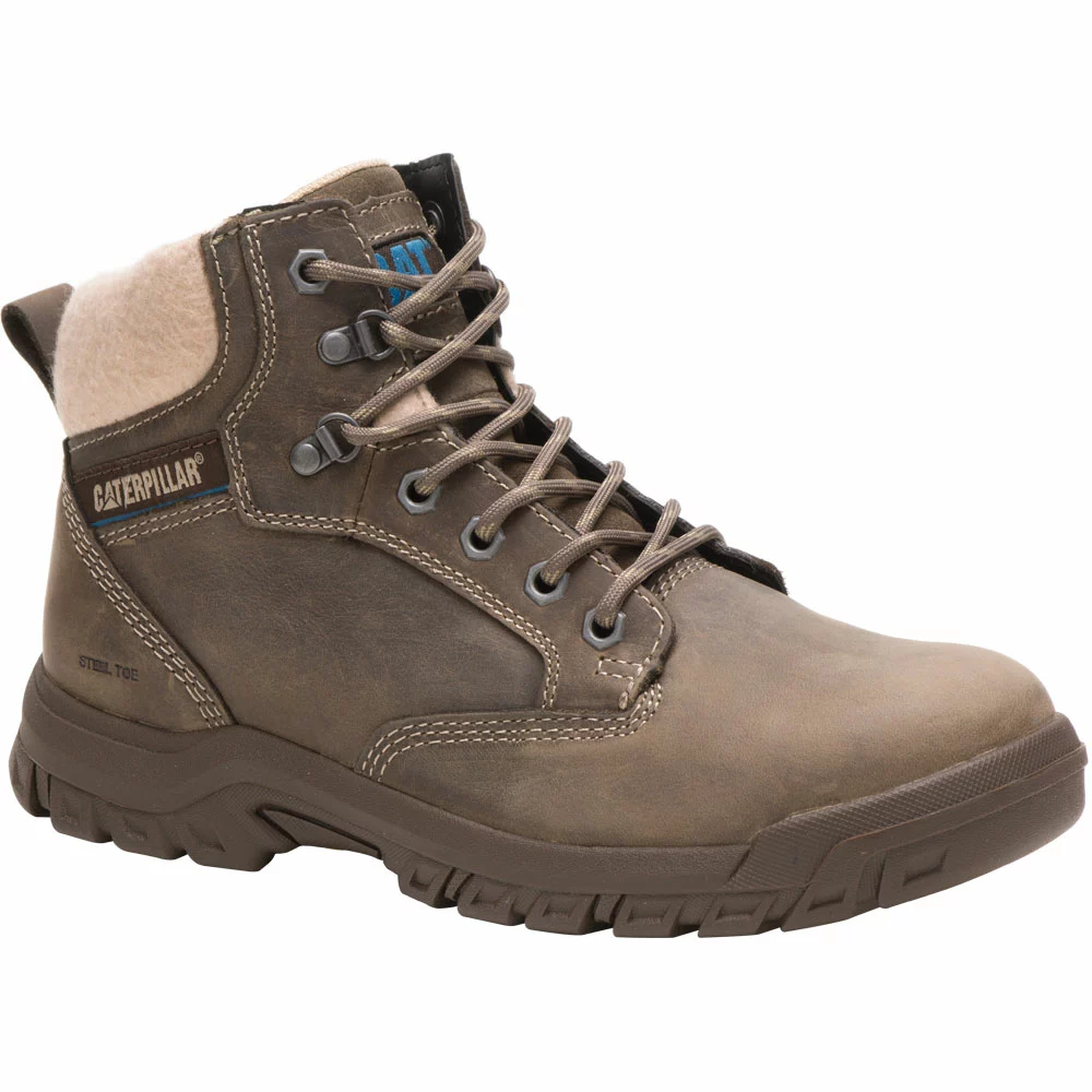 Caterpillar Footwear Tess St Safety Toe Work Boots – Womens. Stay comfortable even throughout long work hours with the Tess Steel Toe Work Boot from Caterpillar Footwear. These womens safety toe work boots are made with a durable leather upper and strobel construction that keeps your movements flexible. The slip-resistant rubber outsole provides traction that keeps you steady in any environment. A faux fur fleece textile provides warmth in cooler weather. A nylon shank and ERGO technology provide added stability and support.