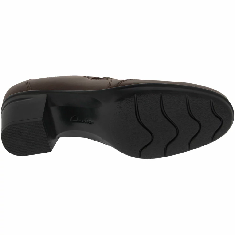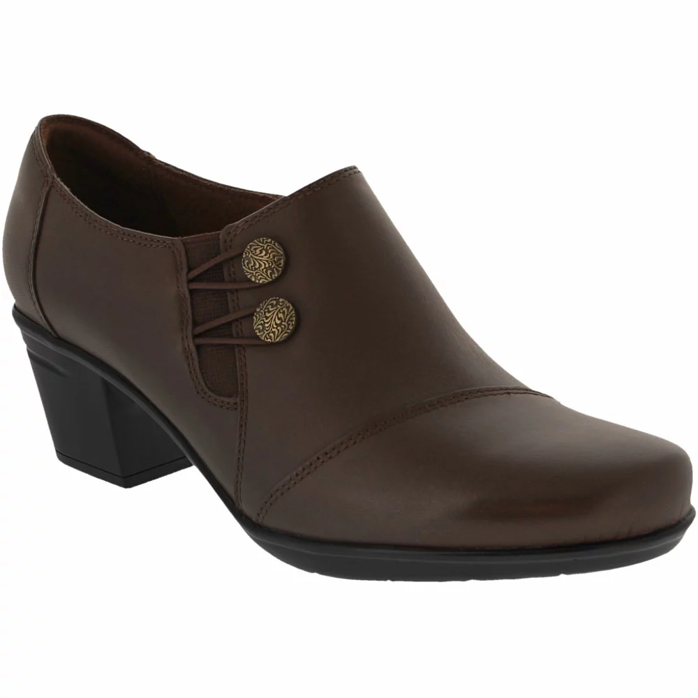 Clarks Emslie Warren Women’s Casual Dress Shoes. Make a distinct impression at the next office meeting or day out with a slip-on loafer. Strap fastenings hook onto embellished buttons for a bit of visual flair on otherwise smooth leather women’s casual shoes. Discreet elastic makes slipping into these comfortable shoes all the easier. The 2” chunky heel gives added lift without the discomfort of thinner heels. The Ortholite footbed and Cushion soft foam inlays minimally compress feet while providing maximum comfort.