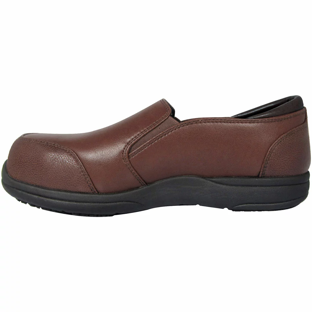Genuine Grip 352 Composite Toe Work Shoes – Womens. Looking professional while staying protected is easy when wearing these womens composite toe work shoes. Stylish slip-ons that have the appeal of a casual work shoe while also providing toe and electrical hazard protection. The sleek microfiber upper features side gore panels for flexible, comfortable wear. A cushioned insole and foam midsole offer all-day comfort while the outsole provides grippy traction.