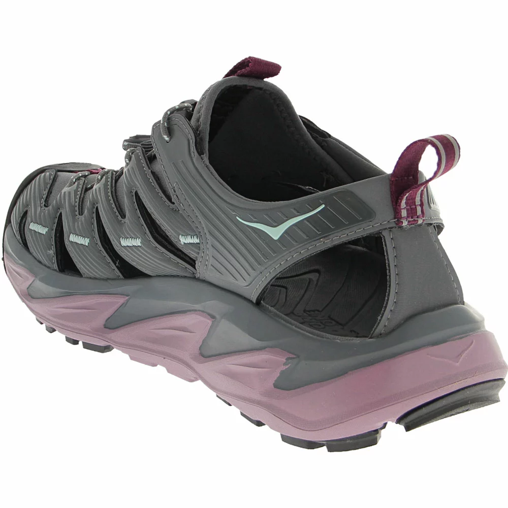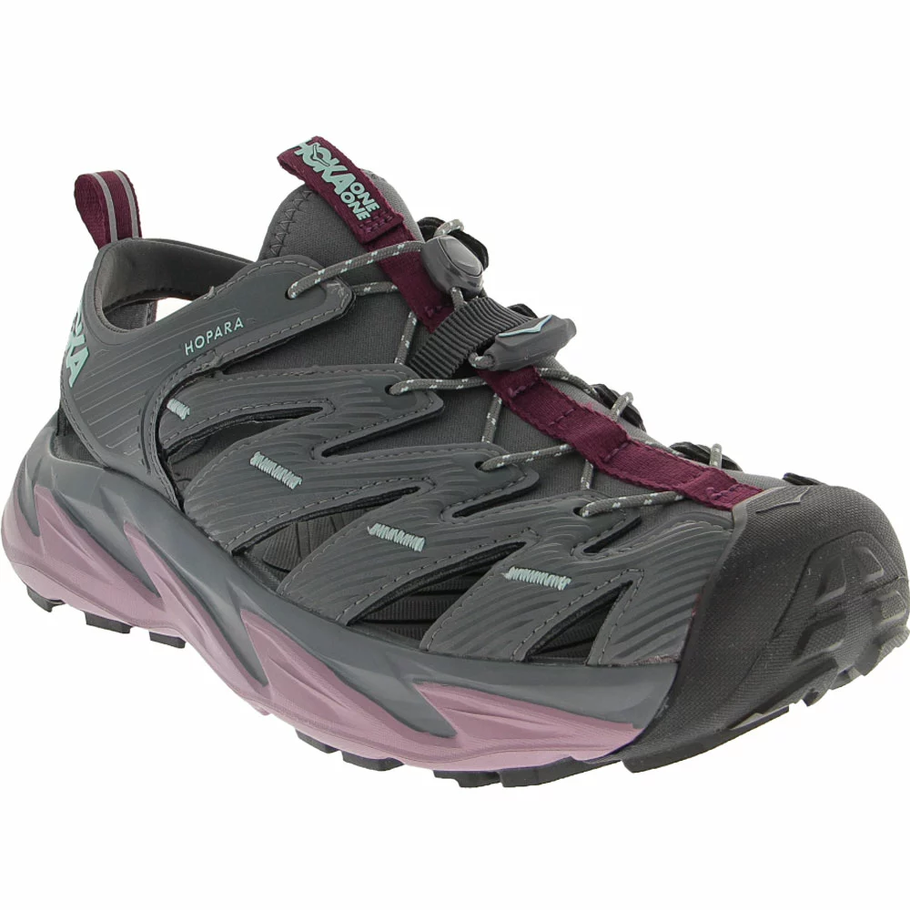 Hoka One One Hopara Outdoor Sandals – Womens. Staying cool and dry while on the go is essential. These womens athletic sandals are designed to ensure that happens. Whether facing dry or wet conditions, they provide a secure, stable fit that can handle various terrains. Sleek and stylish, the soft synthetic upper has cutouts for ventilation and drainage and a lace securement for a custom fit. Every step gets a boost from a flexible, cushioned EVA midsole while the lugged outsole provides a high grip.