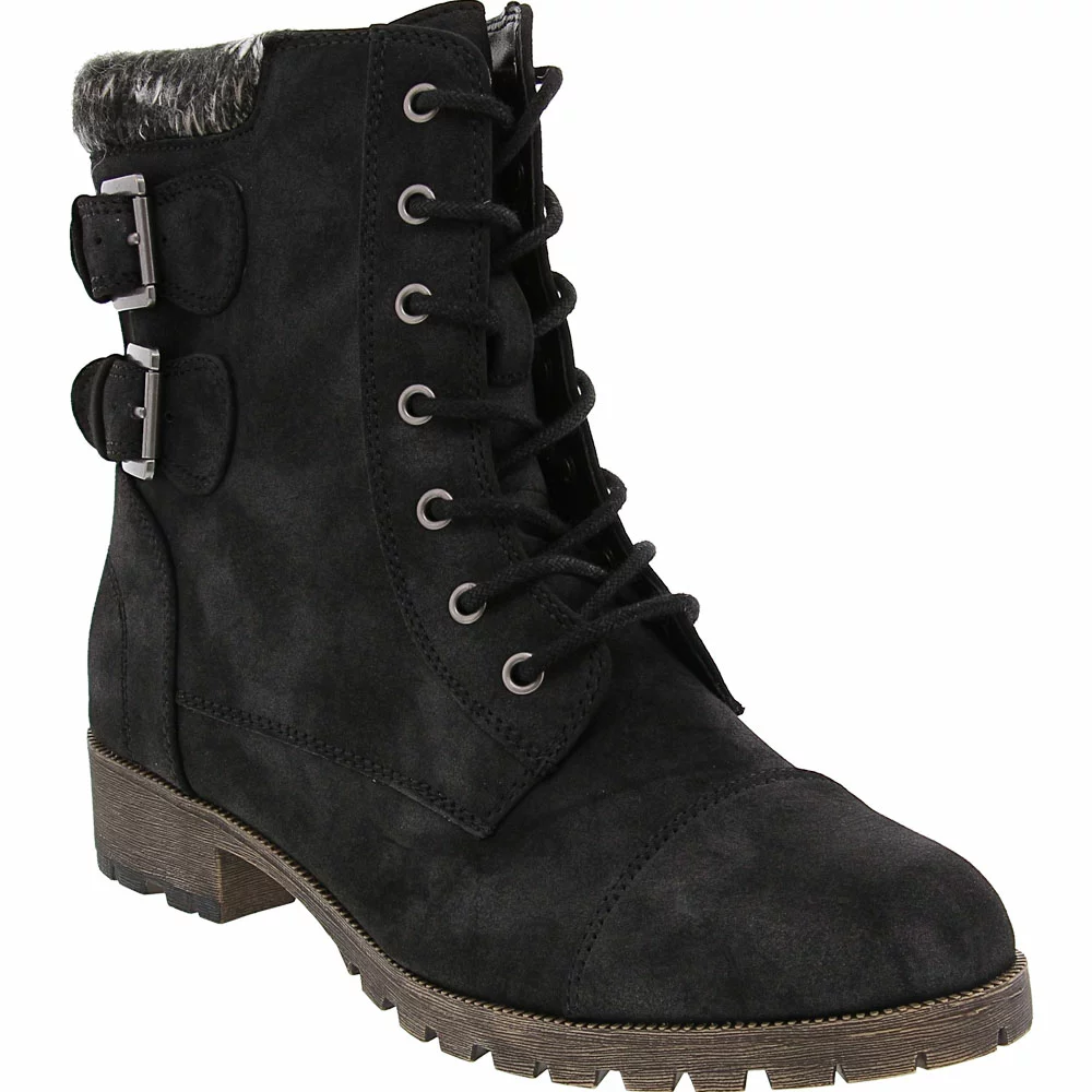 Jellypop Apollo Ankle Boots – Womens. Turn heads with the edgy look of these womens ankle boots. Combat boot style gets feminine accents with the soft knit cuff and buckled strap accents. The rugged TPR outsole provides superior traction while the cushioned latex foam insole keeps you comfortable on your feet. Zip closure with laces gives you a secure fit. These versatile boots pair well with a range of fall and winter fashions and look great with jeans, skirts and casual dresses.