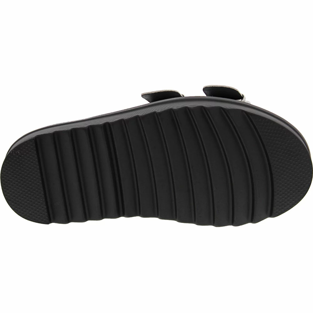 Slide into retro summer style by donning these womens sandals. Featuring a rock-style vibe, these slide-ons deliver both flair and comfort to rev up warm-weather fun. They have a faux-leather upper with metal buckle straps. The thick and flexible midsole features contrast stitching and provides a 1.8-inch platform for a touch of height. The footbed is cushioned and contoured to feel soft and natural while the durable lugged outsole provides support and traction.