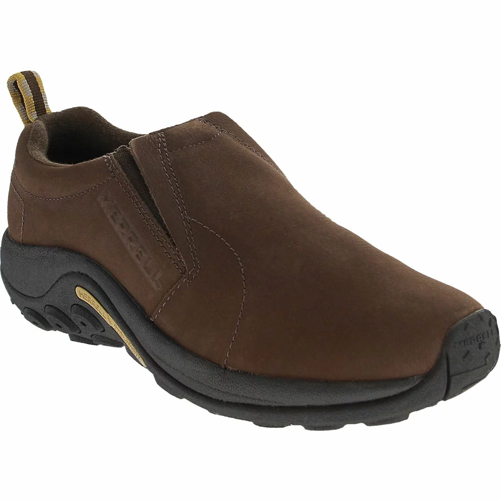 Merrell Jungle Moc Nubuck Womens Slip On Casual Shoes. Stay comfortable and active with the Merrell Jungle Moc Nubuck slip on. A durable nubuck leather upper is lined and treated with Aegis antimicrobial solution to keep these kicks smelling as good as they look. Merrel Air Cushion in the heel absorbs and adds stability. Sticky rubber outsole helps maintain your steady stride.