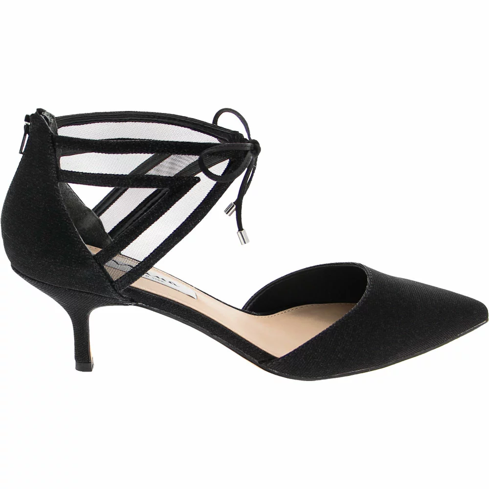 Nina Talley Prom Dress Shoes – Womens. Shine bold and bright with the chic and classy Nina Talley dress pump. Shimmery fabric uppers meet a wrapped mini kitten heel for an effortlessly polished silhouette. This pointed-toe shoe also features an ankle strap with suede and mesh cutout details, along with a back zipper and bow tie closure that are both charming and practical. A lightly padded footbed and smooth synthetic linings add comfort to your stride.
