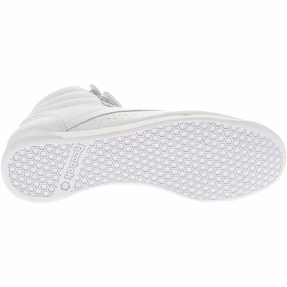 Reebok Freestyle Hi Womens Athletic Shoes. Reebok Freestyle Hi Womens fitness shoe makes a great addition to your active lifestyle. Soft, garment coated leather upper with a double adjustable ankle strap for a custom fit. The unique lacing system allows for a snug fit which gives you stability and support. Padding around the ankle collar and the use of coated leather for support and added comfort. EVA midsole and terry cloth lining provide lightweight cushioning so you keep moving long after others have stopped. High abrasion rubber outsole for traction and durability.