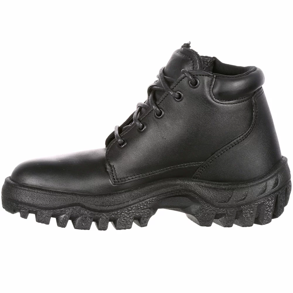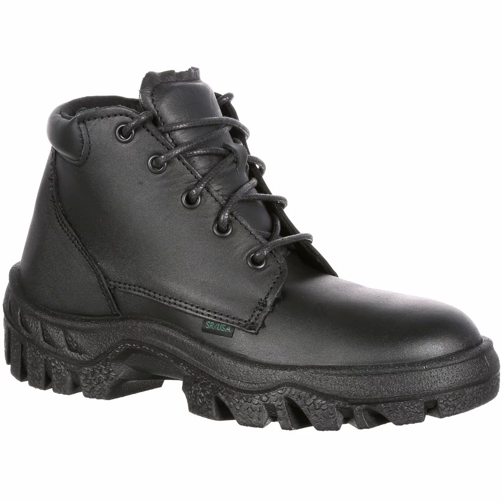 Rocky Tmc Postal Duty Chukka Women’s Steel Toe Work Boots. You should demand comfort and confidence from your womens steel toe boots. Made with high quality materials, these boots are designed for tough work. The cushioned footbed provides comfort, circulation and durability. Enjoy a workday with no aches and pains. Perfect for the work environment, these boots feature a slip and oil resistant TPU outsole. Composed of solid black, full grain leather, it retains a professional appearance while staying waterproof.