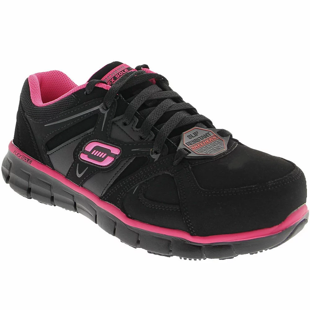 Skechers SK 76553 Synergy Sandlot ST Women’s Alloy Safety Toe Work Shoe. If you are looking for a safety toed work shoe that is flexible and feels like you are walking on a cloud check out the Skechers Sk 76553 Synergy Sandlot ST for women. A nubuck leather upper and slip resistant sole are just the start to this shoe. A flexible sole, memory foam insole and an alloy safety toe cap round it out.