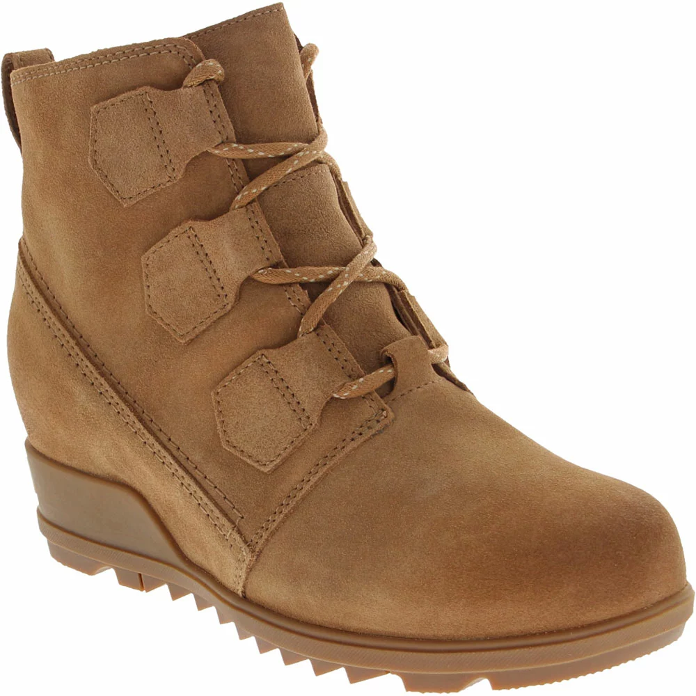 Sorel Evie Lace Casual Boots – Womens. The Sorel Evie Lace has a versatile style that makes it easy to dress them up or down depending on your mood. These womens casual boots feature a wedge heel that is flattering while keeping you stable. An EVA footbed provides plenty of cushioning and support to keep you feeling comfortable throughout the day. The molded rubber outsole uses pattern disruptions to improve traction. A heel tab helps you pull them on easily and the lace-up closure keeps them secure.