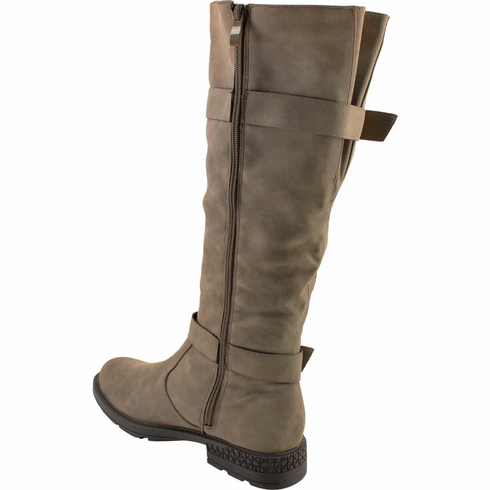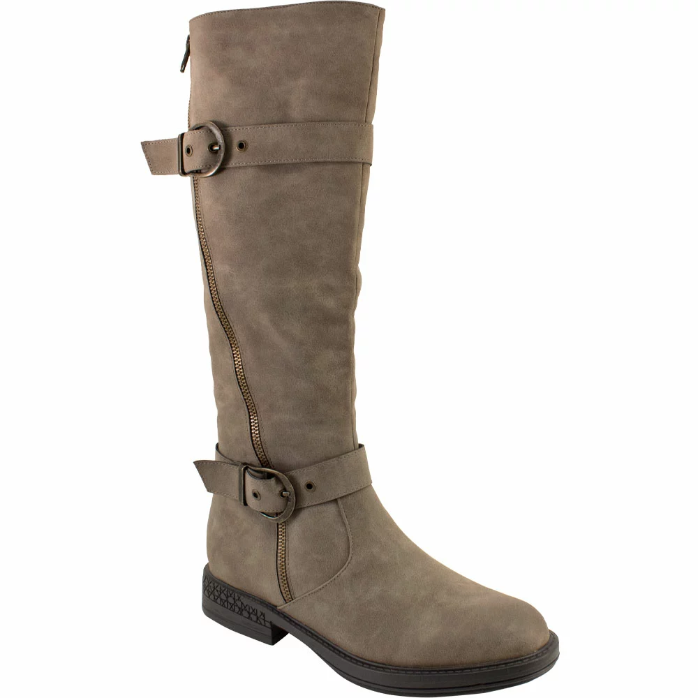 Two Lips Too Jordy Tall Dress Boots – Womens. Enjoy superior comfort and style with these womens tall dress boots. These trendy riding boots have PU uppers with zip closures and adjustable buckles at the calves. Soft memory foam insoles keep you comfortably supported while rubber outsoles give you stability and traction. A rounded almond-shaped toe gives these boots a versatile and feminine look that works beautifully with your favorite cool-weather outfits.