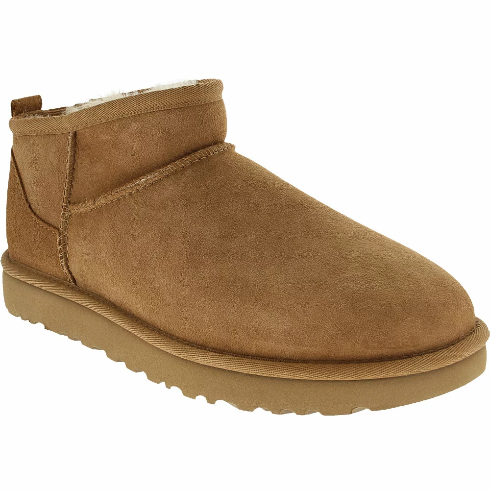 UGG Classic Ultra Mini Comfort Womens Winter Boots. Add some style to your cold-weather attire with these womens winter boots. They have the iconic look of the original with the aesthetic of an ankle bootie. These slip-ons feature a soft, water-repellant sheepskin upper with stitch details that add a touch of sophistication. Even when the temperature dips, the sheepskin lining keeps feet warm and cozy while also letting them breathable. These durable and flexible boots have a durable outsole that offers optimal traction.