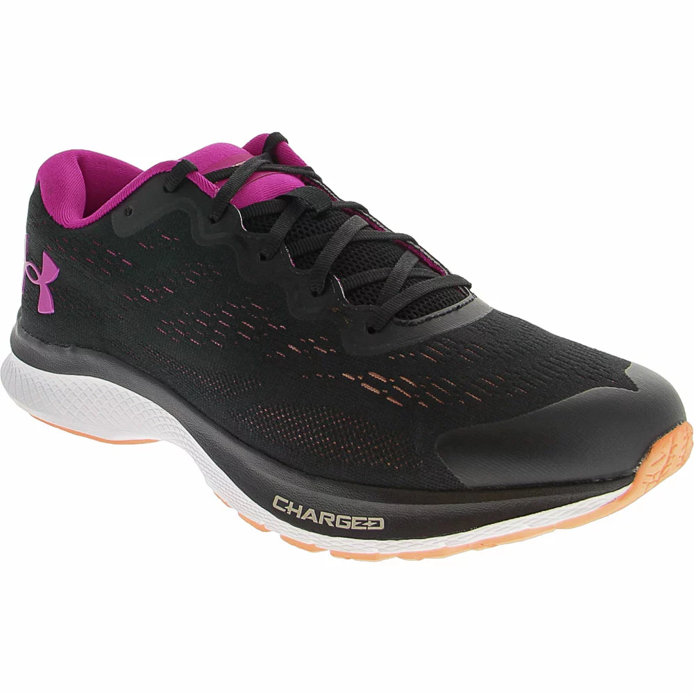 Under Armour Charged Bandit 6 Running Shoes – Womens. Let these lightweight womens running shoes support you for the long haul. The engineered mesh upper has a padded collar and tongue for a secure, cushioned fit. The midsole features a TPU shank for enhanced stability and Charged Cushioning technology for targeted softness and support. A molded full-length sockliner keeps you cushioned and comfortable while preventing slippage. The durable solid rubber outsole gives extra coverage to high-impact zones without added weight.