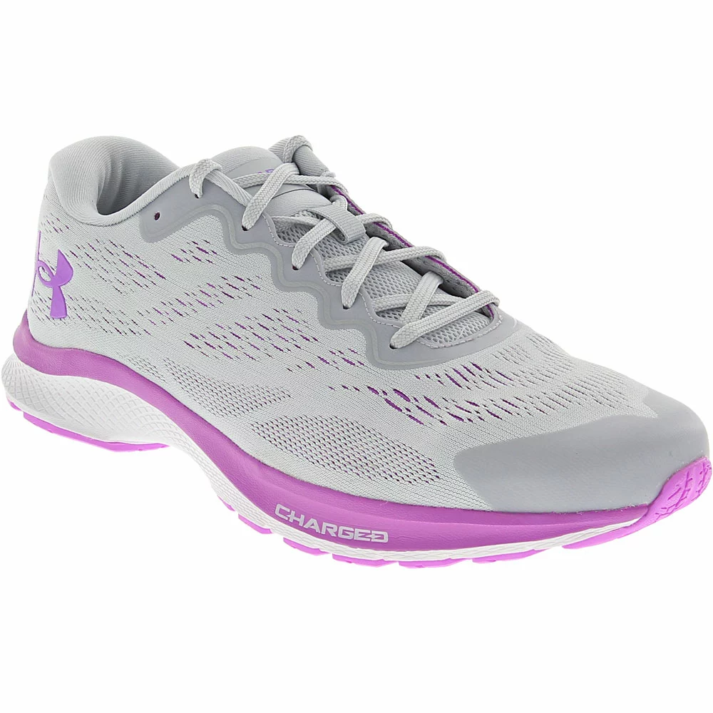 Under Armour Charged Bandit 6 Running Shoes – Womens. Let these lightweight womens running shoes support you for the long haul. The engineered mesh upper has a padded collar and tongue for a secure, cushioned fit. The midsole features a TPU shank for enhanced stability and Charged Cushioning technology for targeted softness and support. A molded full-length sockliner keeps you cushioned and comfortable while preventing slippage. The durable solid rubber outsole gives extra coverage to high-impact zones without added weight.