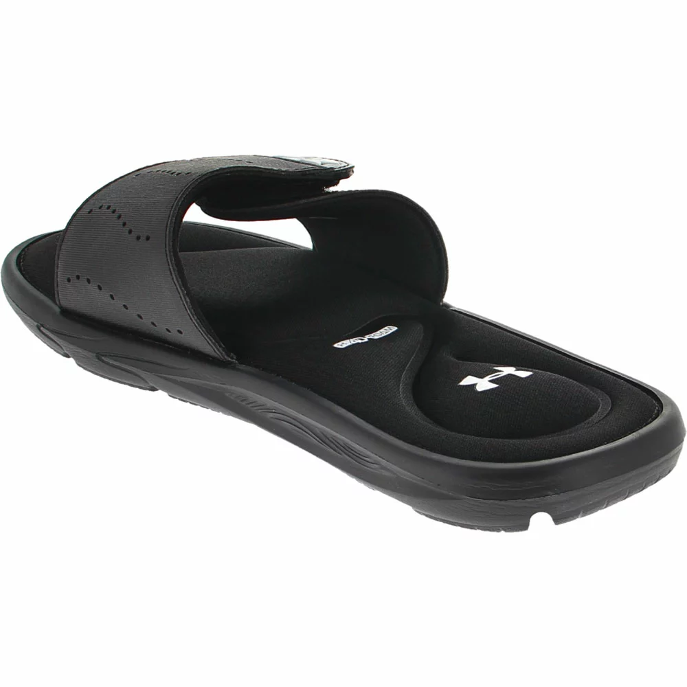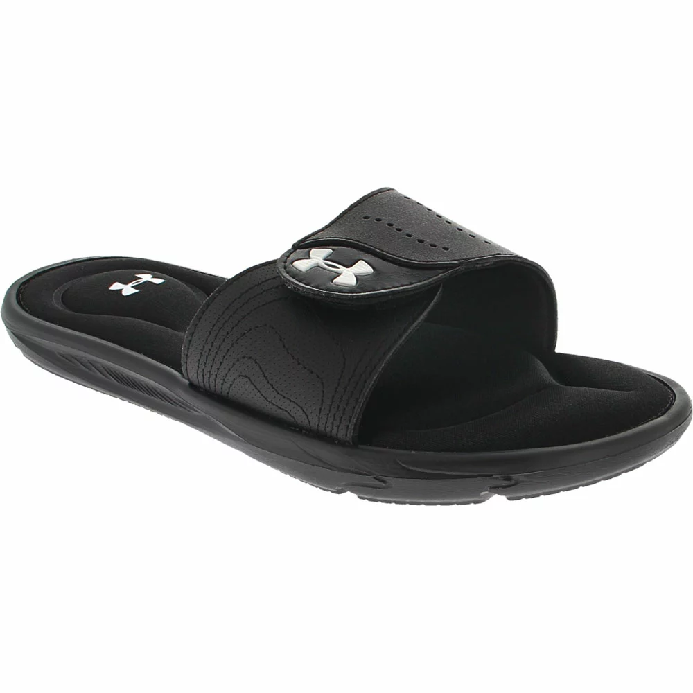 Under Armour Ignite IX Womens Slide Sandal. Keep your feet comfortable all day long with the Ignite IX from Under Armour. These womens slide sandals are designed with anatomical contours that provide cushioning and support just where you need it. The EVA outsole uses traction pods the give you added grip while increasing durability. Performance 4D Foam in the footbed conforms to your foot, making these shoes extra comfortable. They have a slip-on design for easy on and off, and the strap is adjustable to give you the perfect fit.